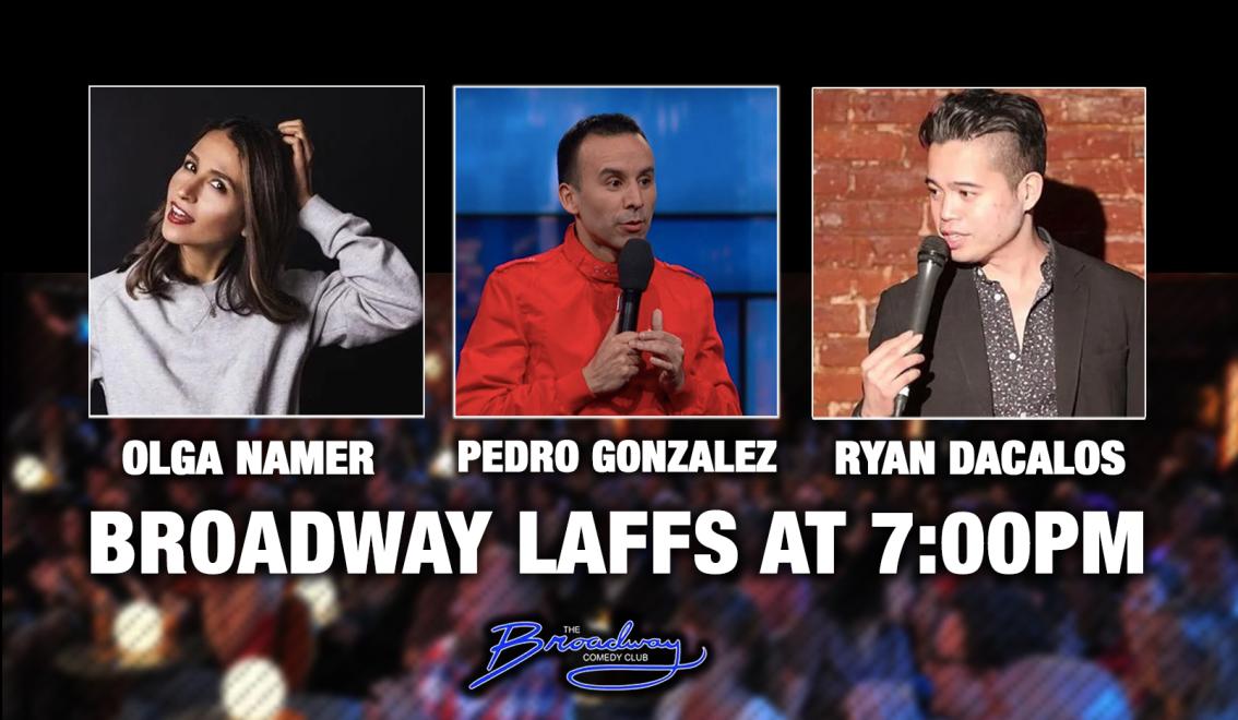 BROADWAY LAFFS ft. Olga Namer, Pedro Gonzalez, Ryan Dacalos.  Come to Broadway Comedy Club for huge laughs on BROADWAY LAFFS. Join us for this hilarious New York City Comedy experience. This show is a mix of citywide stars, comics seen on TV, and fresh faces so you can kick off your evening with a lot of laughs! A evening of BROADWAY LAFFS.